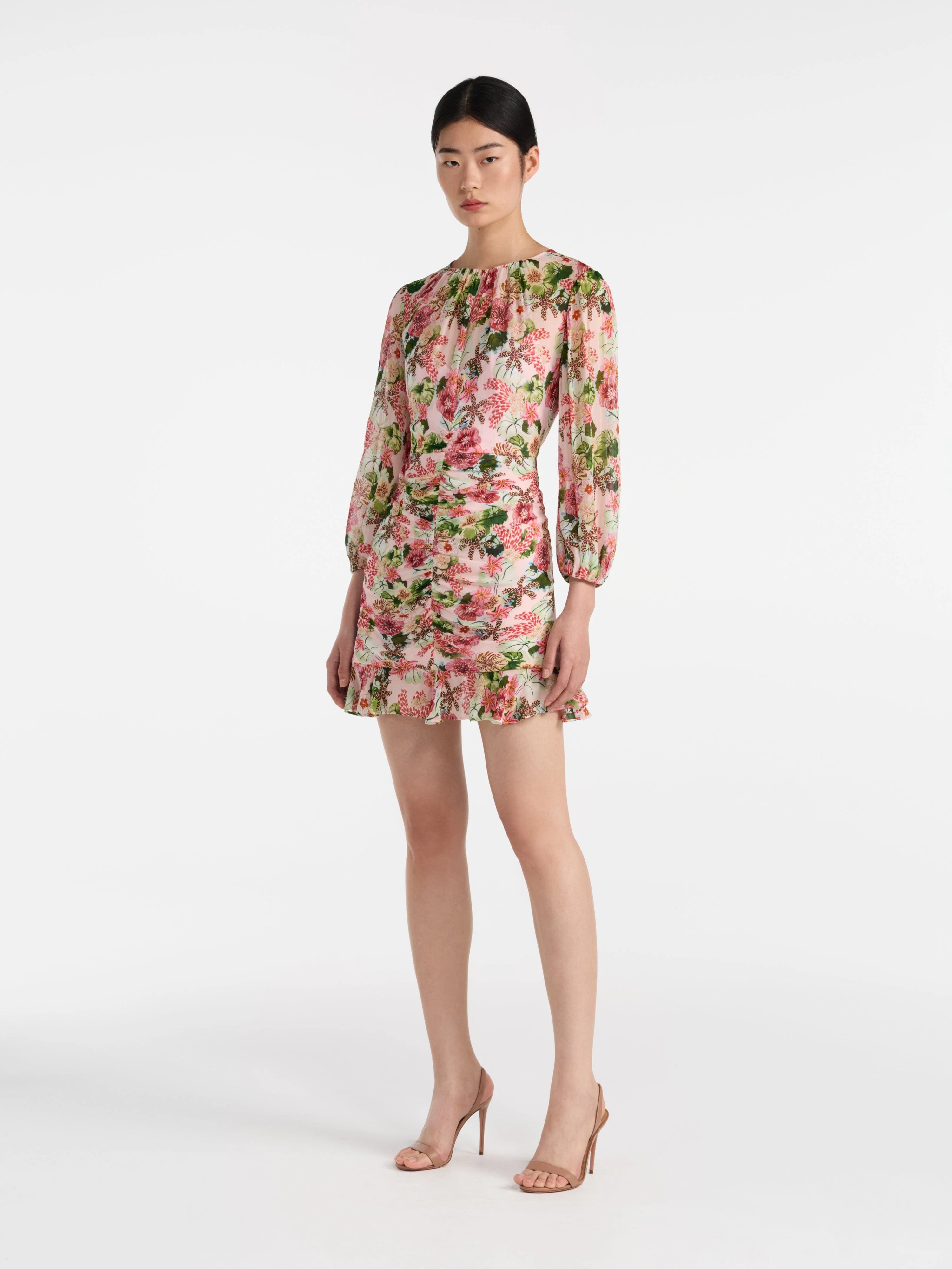 The Astrid Short Dress captures the essence of modern femininity channelled through SALONI’s signature of bold and playful sophistication. Its round, gently gathered neckline is complemented by subtle puff sleeves, creating graceful texture and volume. A ruched centre front flatters the form, leading into a frilled hem that moves with every step. Verdant leaves and coral feather flowers bloom across a soft blush base, infusing the dress with a romantic spirit.