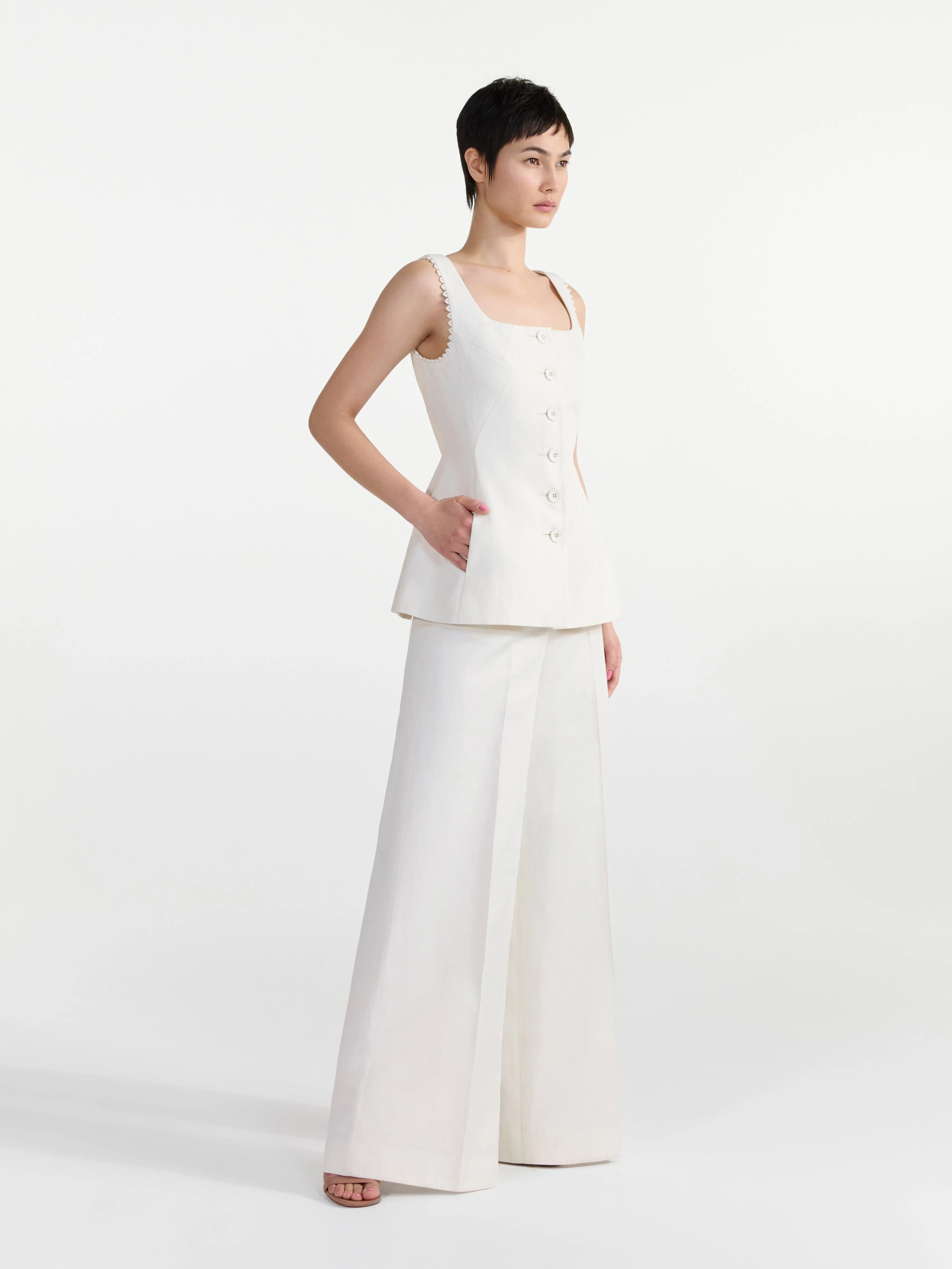 A seamless hybrid between a top and a blazer, our sleeveless Bibba jacket is a contemporary update of the classic suit. Featuring a sculptural silhouette, with a fitted waist and a peplum hem, this terracotta-hued jacket features a square scooped neckline and thick shoulder straps, with princess-line seams for a flattering fit. Pockets are subtly hidden in the seams of the bodice to allow for a streamlined look. Pair with the matching trousers to make a statement at formal events.
