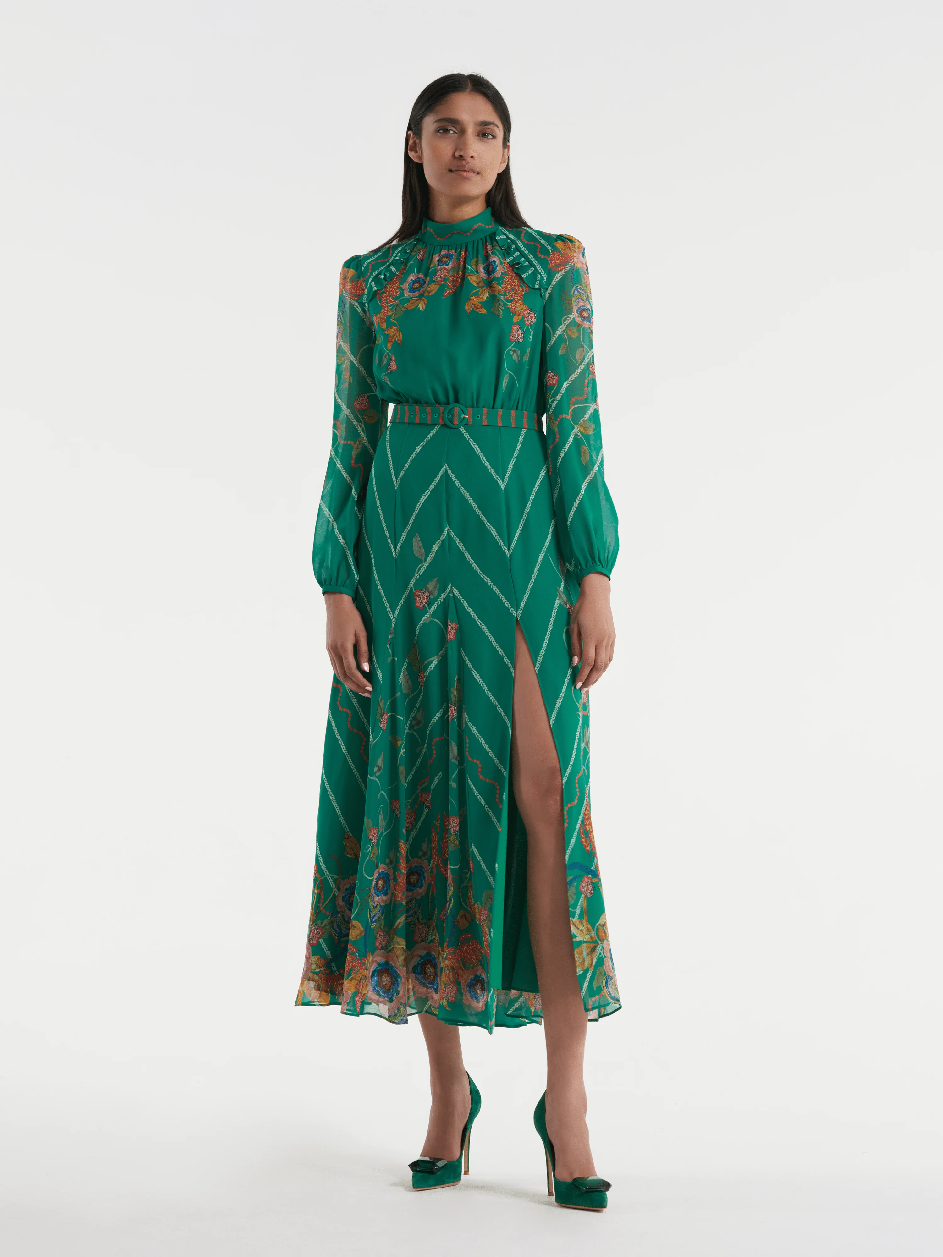 Our Jacqui B dress in the Emerald Barley print is cut in silk chiffon. Wild roses, late-summer leaves, and a tangle of vines creep up a trellis of barley stripes on a rich emerald georgette. This dress features a fitted waist and bodice with gently puffed sleeves and a full-length skirt with a thigh split.