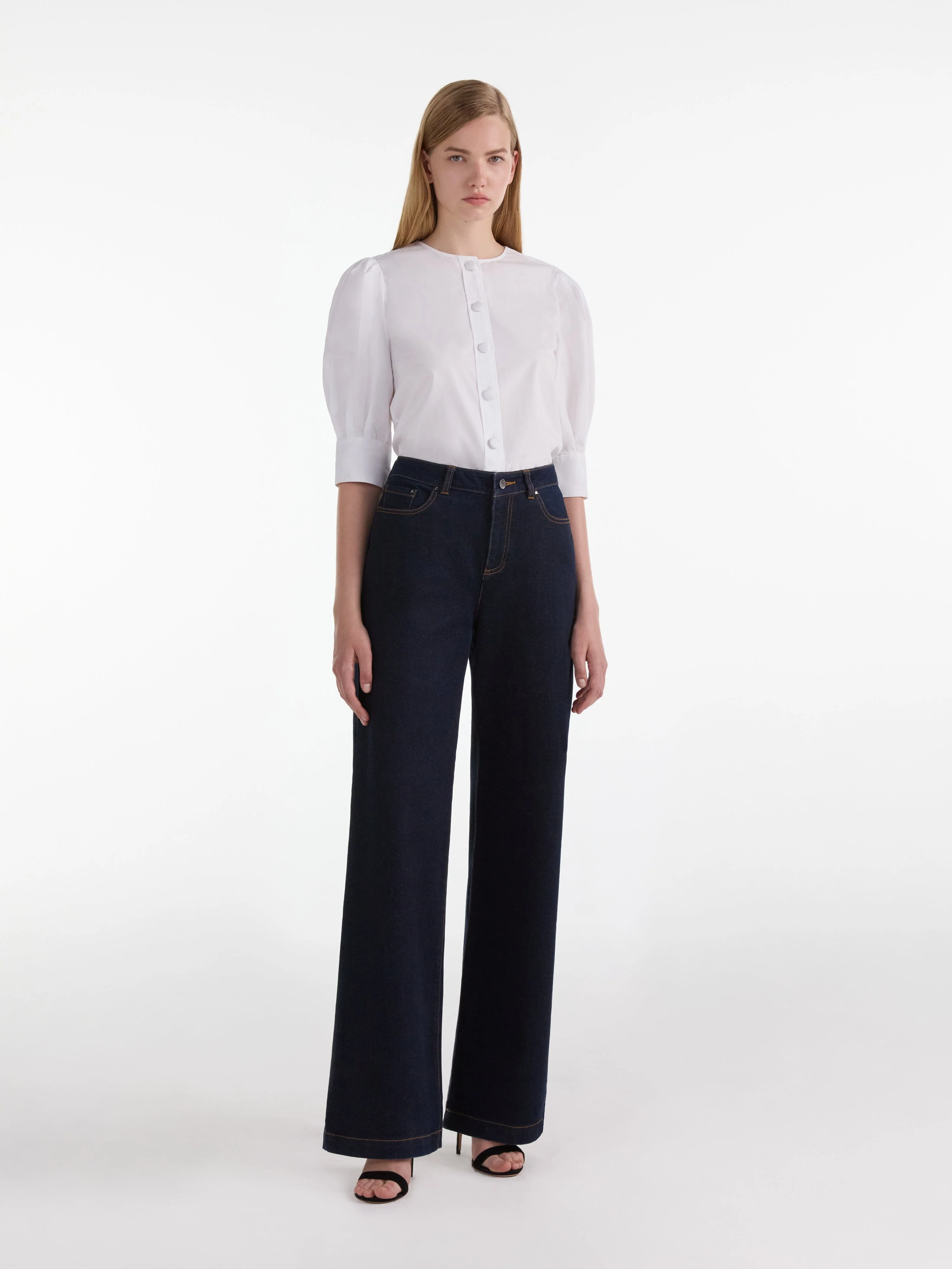 The Jojo Shirt is relaxed yet polished. Cut from white cotton and featuring a pleated back detail, this shirt incorporates gathered puffed sleeves and large covered buttons, adding a playful touch to this refined and versatile wardrobe hero.