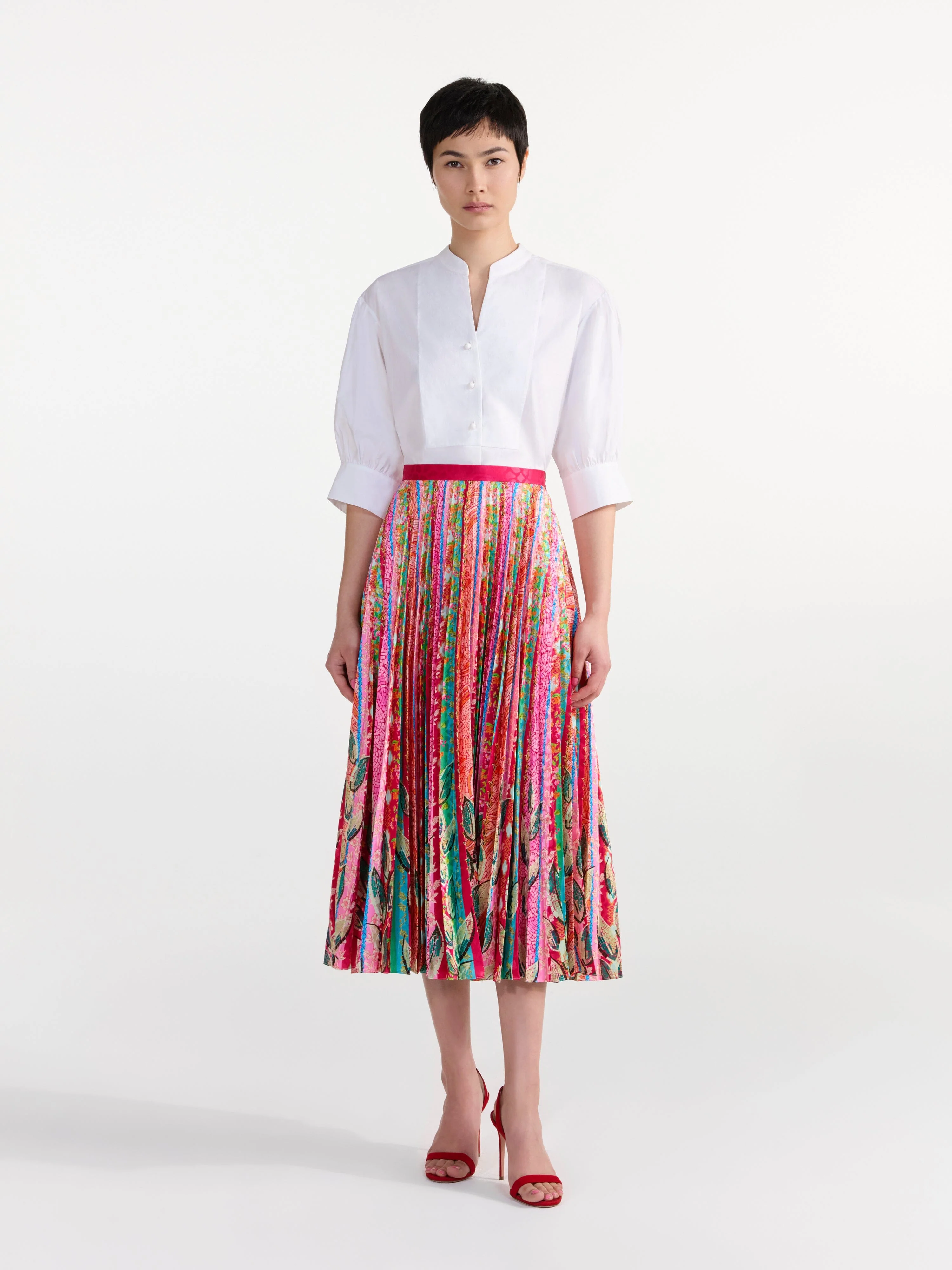 The Kim Skirt in Mosaic Stripe is a kaleidoscopic reimagining of our classic sunray pleated skirt. Striking mosaic blooms inspired by Venetian artistry, form colourful graduating stripes. This sophisticated midi skirt features a fitted waistband, perfect for pairing with a fresh white shirt for an elevated all-day look.