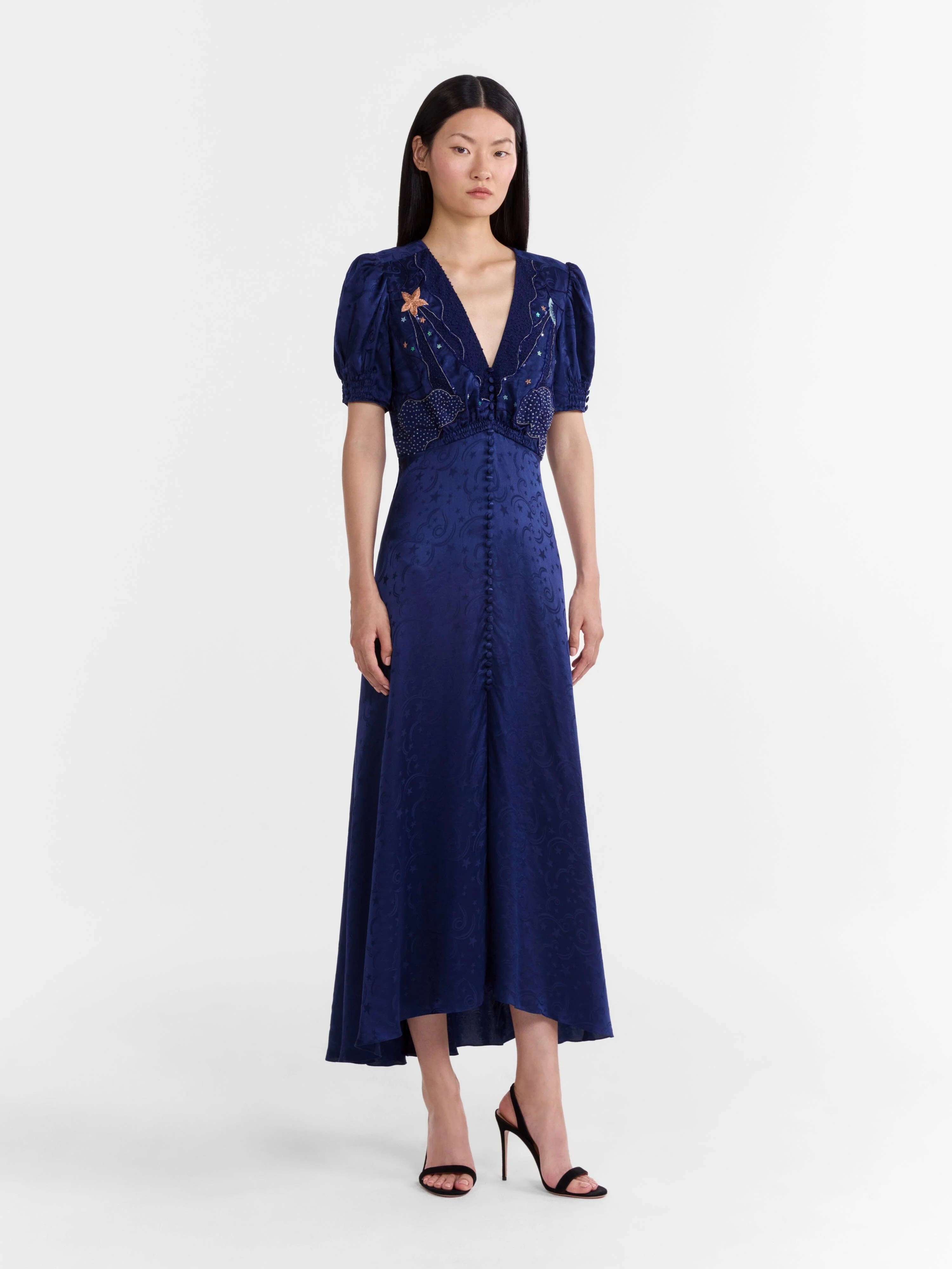 A signature shape, the Lea Dress in Navy Astro Embroidered is a wardrobe favourite. It is cut in a stamped satin in a beautifully realised bias cut, meaning it flatters the figure whilst allowing the fabric to glide around the body, for fluid, easy movement.