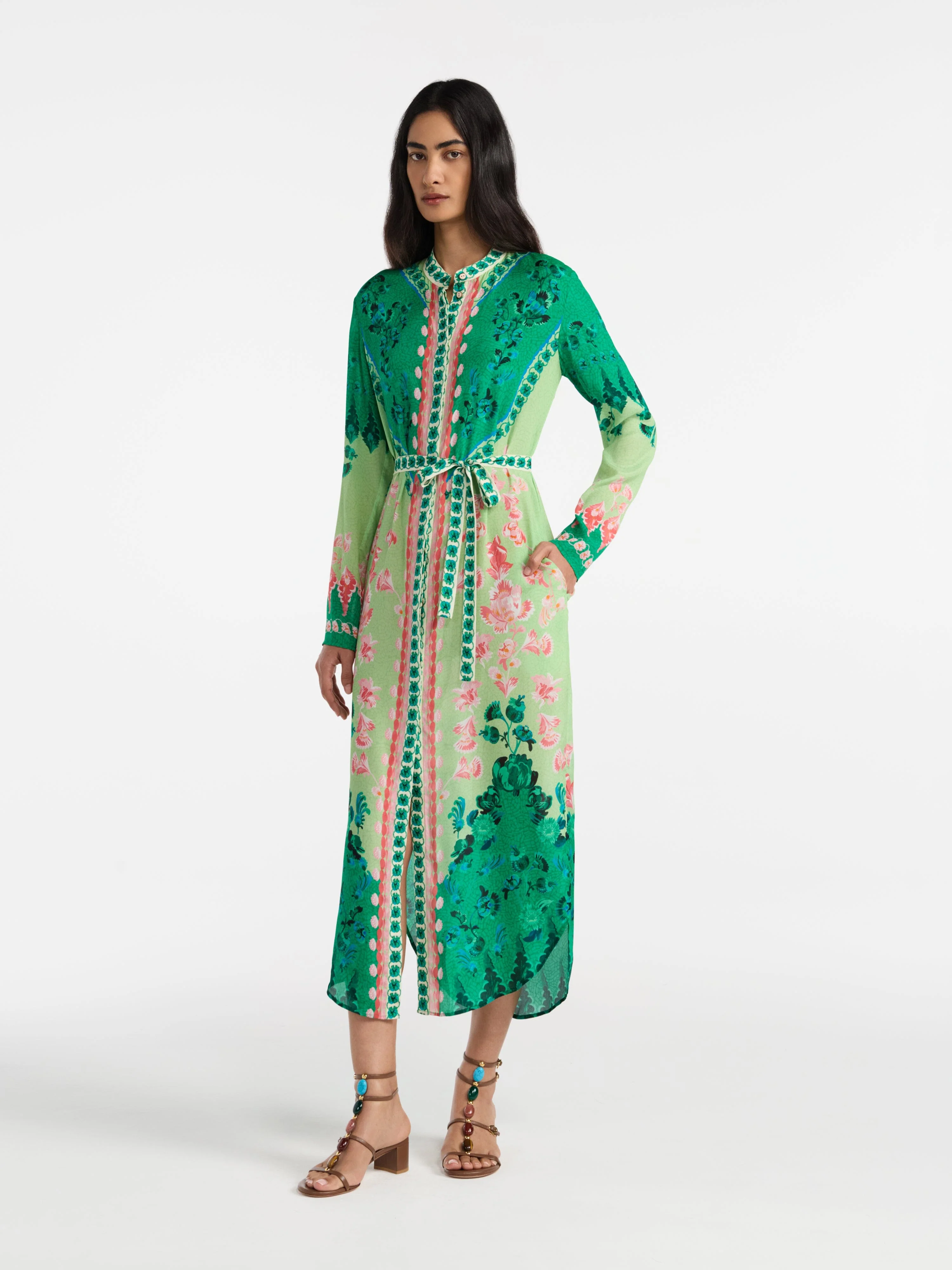 The Molly-D Dress has a comfortable and flattering silhouette elevated with exquisite details. Long sleeves, a tie waist and button-front fastening create a relaxed fit that works for a range of occasions. The placket and tie belt are accentuated with a soft graphic print, while the dress features blush flowers that bloom over a pastel green terrazzo base, framed by verdant colour blocks. A versatile piece that can be styled with sneakers or heels for seamless day-to-evening style.