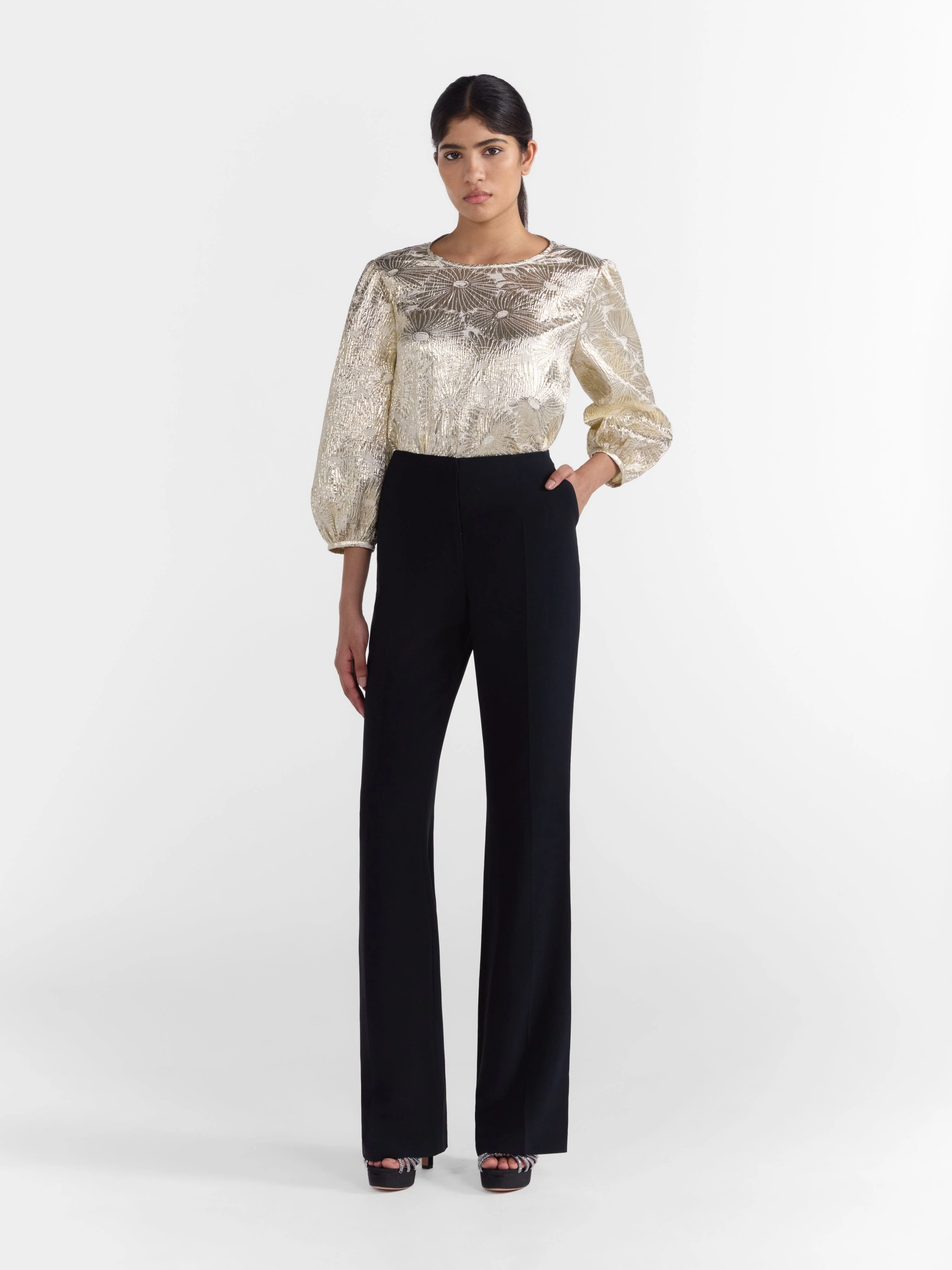 Our Ozzie Top in Pale Gold exudes effortless elegance with its relaxed fit and shimmering gold textured cloque. The top features a round neckline and three-quarter puffed sleeves with cuffs, offering a touch of sophistication. The metallic cloque fabric adds a lustrous sheen, making this cropped top a versatile choice for both day and evening wear.