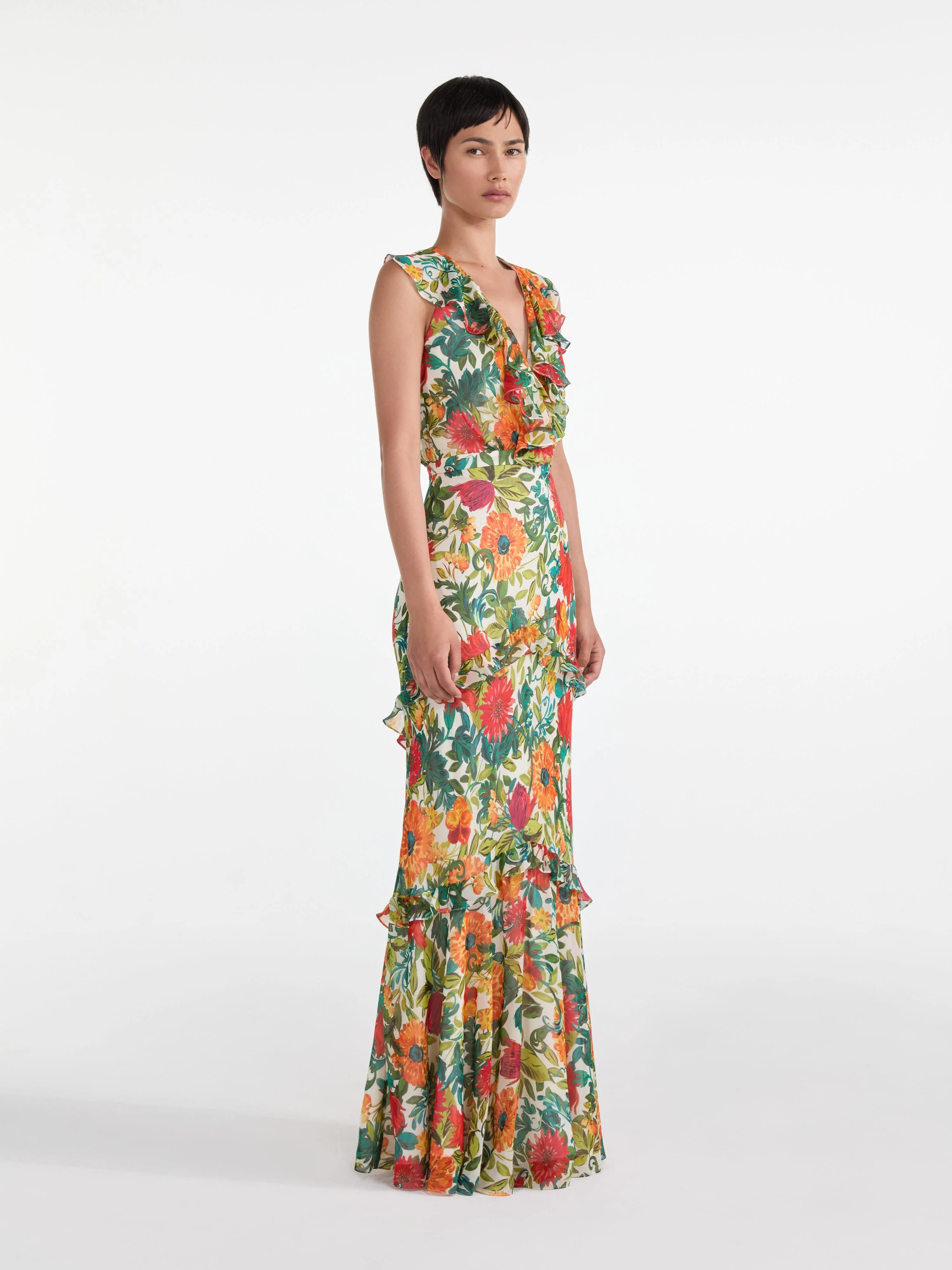 The Rita Dress strikes a perfect balance between sophistication and playful charm. Designed with a fitted waist to flatter the figure, it features soft ruffles tracing the neckline and a fit-and-flare skirt adorned with delicate frills, creating effortless movement with every step. A sumptuous garden of wildflowers blooms across the fabric, vivid reds and fiery oranges bursting from lush, verdant foliage, bringing the joy of summer to life in an elegant, wearable form.
